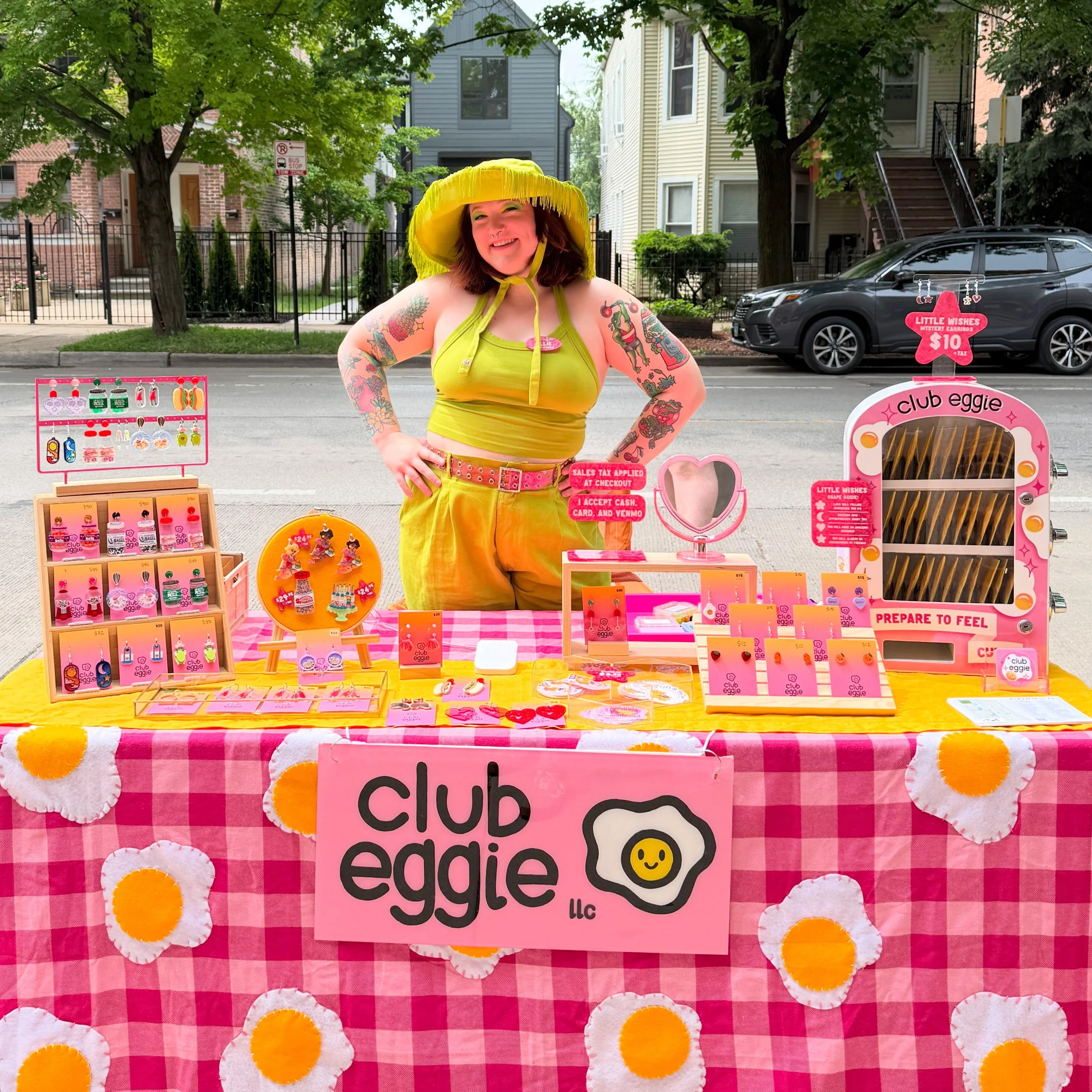 If you’ve wandered through the Ravenswood ArtWalk in recent summers, you’ve probably spotted her booth surrounded by grinning shoppers trying on tiny masterpieces. There’s a reason they can’t walk away empty-handed. Club Eggie’s pieces are clever, unexpected, and full of personality—from earrings that literally dance as you move to miniature shopping bags that hold bananas or the world’s smallest snack. Ellie’s art is interactive, tactile, and just a little mischievous.